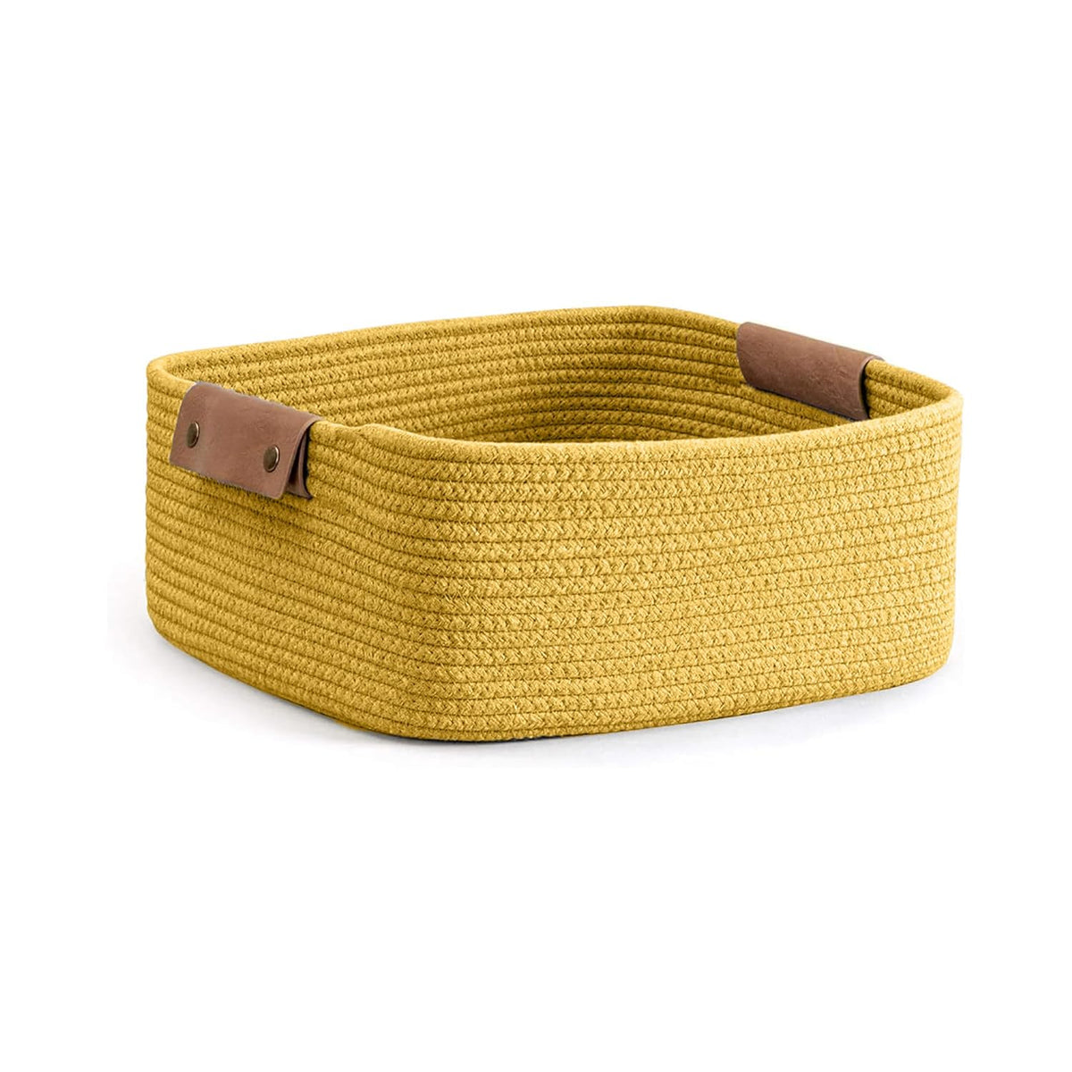 Upgrade your home organization with this stylish mustard cotton rope storage basket. Crafted from durable woven cotton in a warm yellow-mustard shade, it features strong brown leather handles for comfortable lifting and a refined look. Ideal for storing clothes, toys, baby products, towels, or shelf items, this versatile basket adds a cozy touch to any room while keeping your space organized and clutter-free.